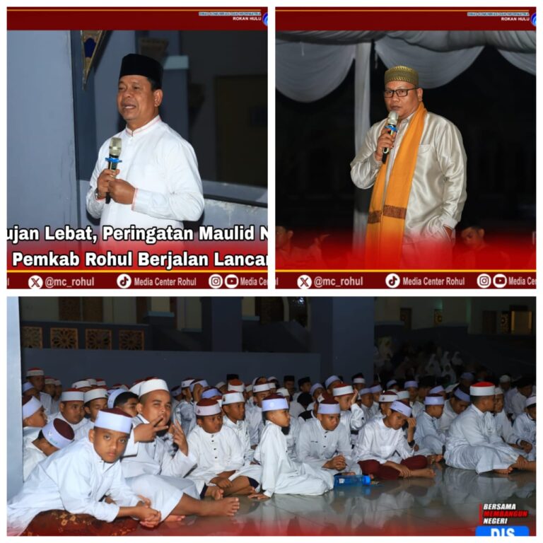 Rokan Hulu, Rokannews– Pemerintah Kabupaten Rokan Hulu (Rohul) menggelar kegiatan Peringatan Maulid Nabi Muhammad SAW 1447 H yang berlangsung khidmat dan penuh makna pada Kamis (04/09/2025) di halaman Masjid Agung Islamic Center, Pasir Pengaraian. Meskipun hujan lebat mengguyur Pasir Pengaraian sekitarnya, ratusan jamaah tetap hadir pada peringatan Maulid Nabi Muhammad SAW 1447 H.